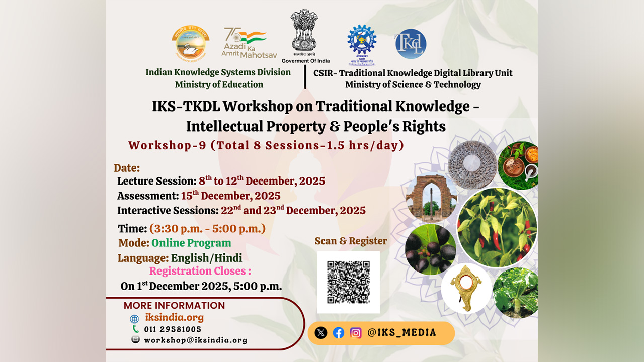 The Indian Knowledge Systems (IKS) Division of the Ministry of Education, in collaboration with CSIR-Traditional Knowledge Digital Library (CSIR-TKDL), is organizing the fifth IKS-TKDL Workshop on Traditional Knowledge - Intellectual Property & People's Rights (Online Mode).